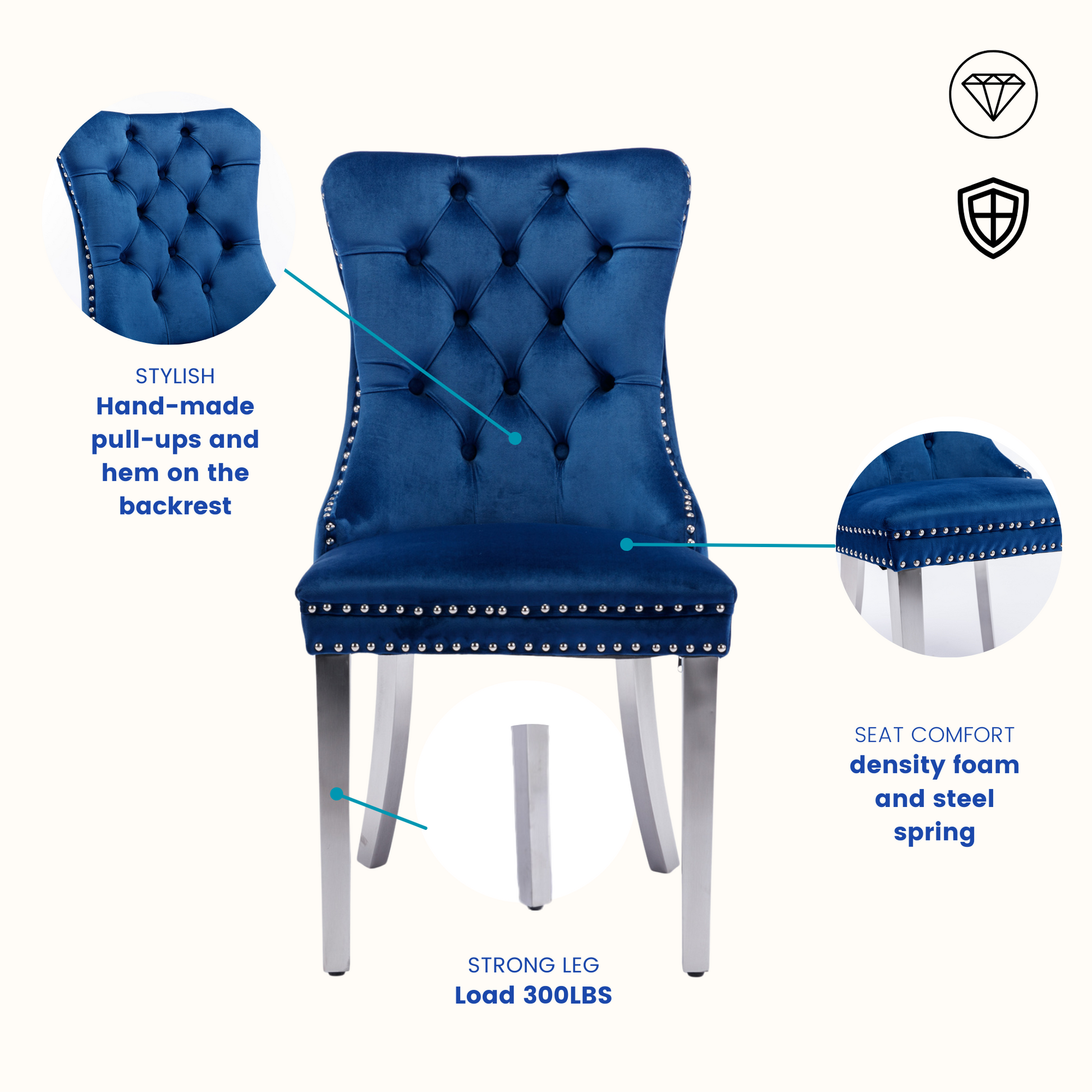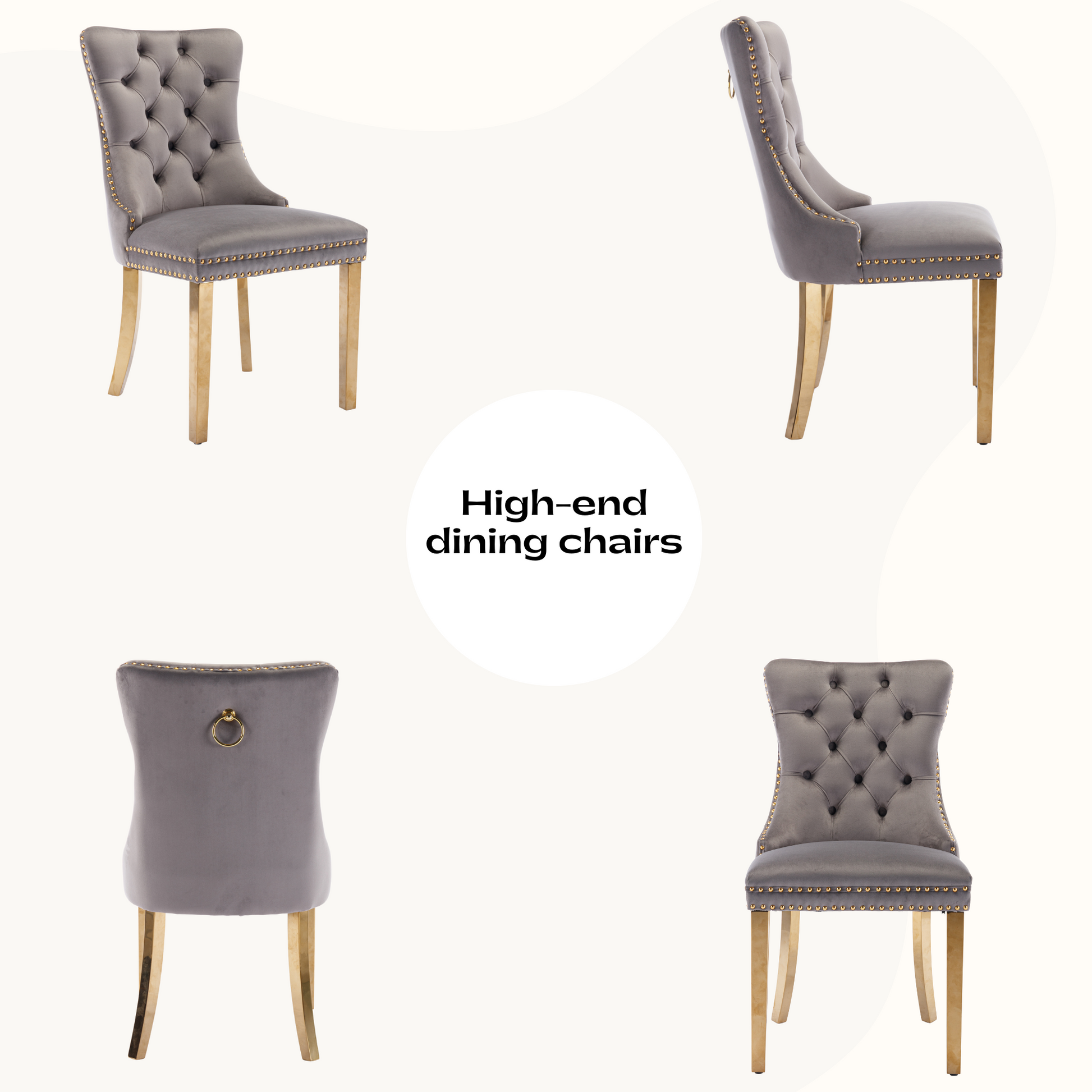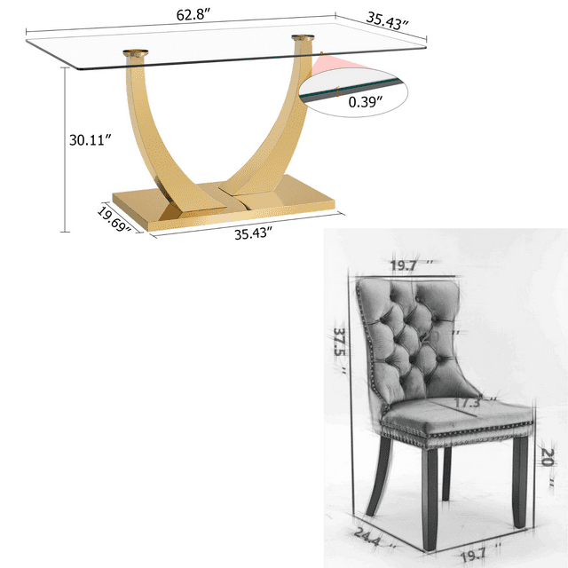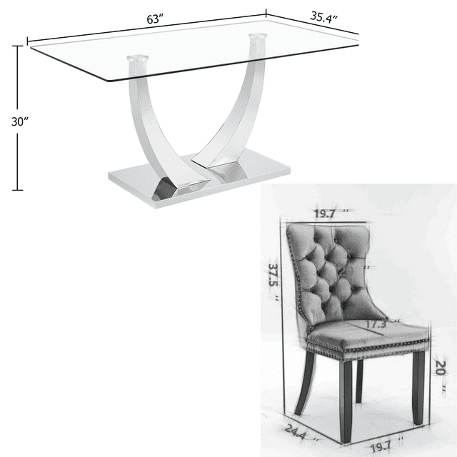 glass tabletop with Golden/Silver legs, this set offers both style and functionality. The Six included High-end Tufted Solid Wood Contemporary Velvet Upholstered Dining Chairs provide a touch of luxury and comfort, making this set perfect for family meals, entertaining friends, or enjoying a quiet breakfast. The large surface area on the table allows for ample space for dining, entertaining, or playing games.Both the table and chairs come with clear assembly instructions and all necessary tools for a quick and easy setup.